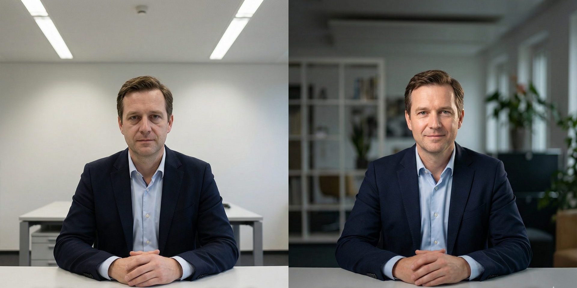 Klassisches Setup mit ein oder zwei Leuchten. Führungslicht leicht seitlich von oben (30–45 Grad), eventuell ein Aufheller oder Kante von der Gegenseite. Ziel: kompetent, nahbar, vertrauenswürdig. Harter Schatten unter dem Kinn wirkt autoritär, weiches Licht auf Augenhöhe wirkt zugänglicher.